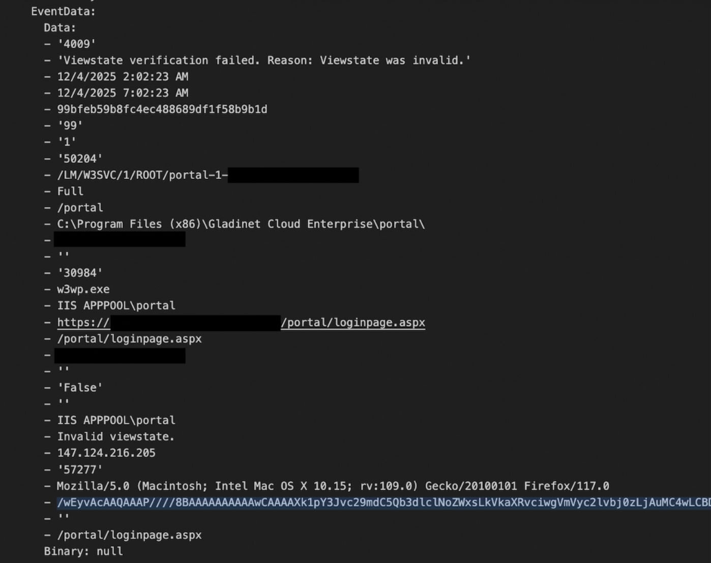 As of December 10, we have seen nine organizations that have been impacted by this vulnerability. These businesses ranged across different sectors, from healthcare to technology. The threat actor connected from IP address 147.124.216[.]205 and attempted to use the exploit (CVE-2025-11371) followed by the new exploit to obtain the web.config file containing the machine key. Once the attacker was able to obtain the keys, they performed a viewstate deserialization attack and then attempted to retrieve the output of the execution which failed.