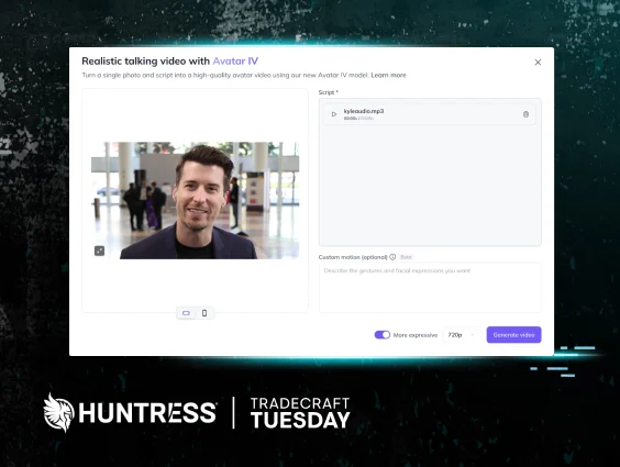 Still, the technology for creating deepfakes that aren’t live has rapidly improved, including text-to-video and text-to-audio tools. In fact, the demo video below shows just how easy it was for us to create a deepfake involving Huntress’ own CEO.