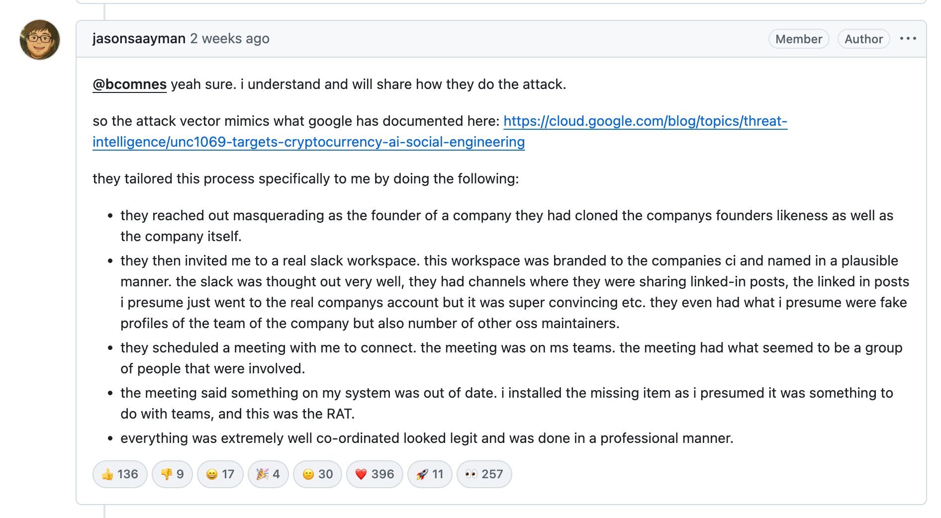 Figure 2: axios maintainer Jason Saayman talked about the attacker’s social engineering tactics