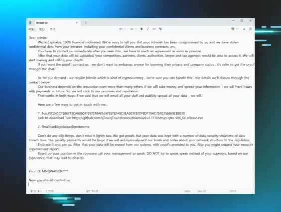 The linked article from InsecureWeb from the ransom note was reportedly posted on 9 July, and the DarkWebInformer article was reportedly posted on 12 August, likely indicating that the Cephalus threat actors are somewhat new on the scene.