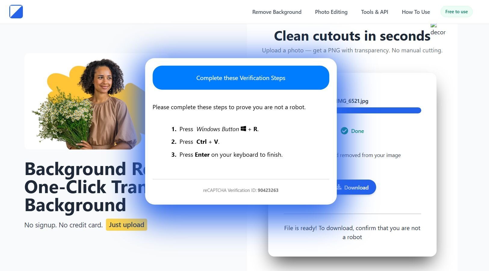 The video below shows how it works. You upload your image, watch a convincing progress bar do its thing, and click Download. Then comes the twist: you're asked to verify you're not a robot. From there, it's pretty self-explanatory, a malicious command gets copied to your clipboard, along with helpful instructions on how to run it.
