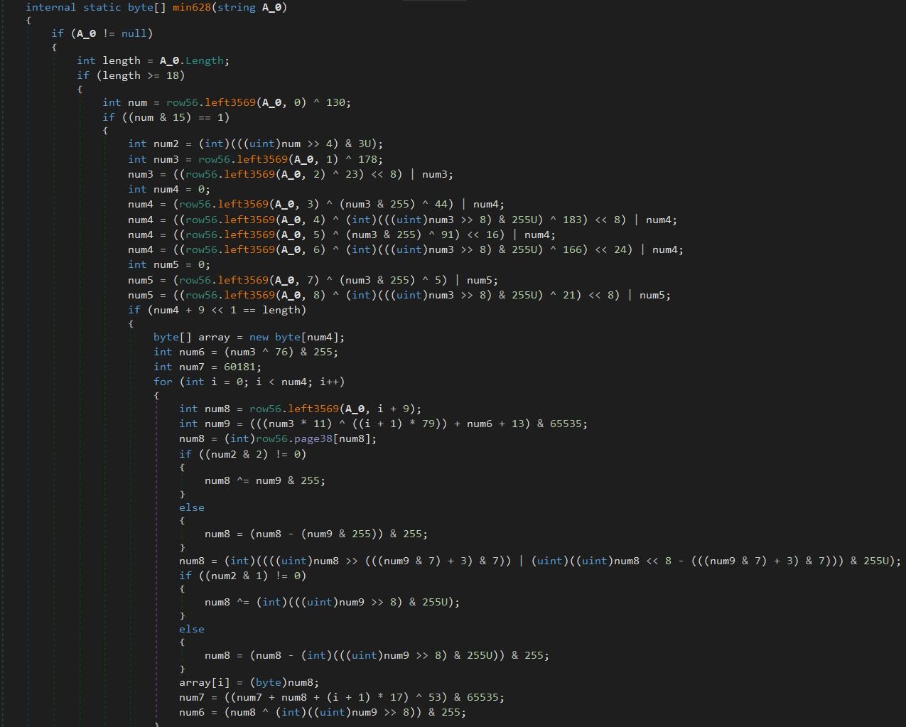 After all four steps, you've got one plaintext byte. The decryptor folds it into the running checksum (num7) and updates num6 so the next byte's keystream will depend on this byte's plaintext. That last part is the most important detail. Because each byte feeds into the next byte's keystream via num6, you can't decrypt any byte without decrypting all the bytes before it. When all the bytes are processed, num7 gets compared against the expected checksum from the header. If they don't match, min628 returns an empty array.