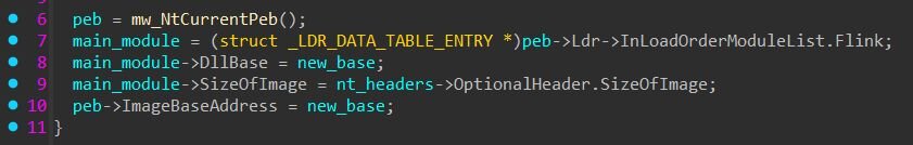 The last thing the loader does before jumping to the entry point is rewrite the PEB. Every Windows process keeps a structure in its own memory called the PEB (Process Environment Block) that tells the process things about itself - what its main EXE is, where it's loaded, what DLLs are mapped. After the embedded PE has been mapped at new_base, three fields in the running python.exe's PEB get rewritten.