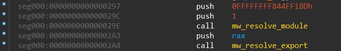 The module resolver takes a scope integer and returns the corresponding DLL base. Each DLL name is built on the stack two bytes at a time.
