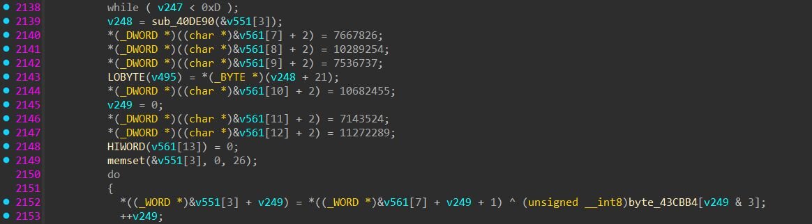 The second pattern is XOR-encoded stack strings. The compiler lays down a buffer of scrambled bytes onto the stack as constants, then a short loop XORs them against a 4-byte key from .rdata. The key only has 4 bytes, so it gets reused: bytes 1-4 of the scrambled string get XORed against the key, then bytes 5-8 against the same key again, and so on. The result is the real string. Most of the operationally interesting strings, such as field names, install paths, header names, use this pattern.