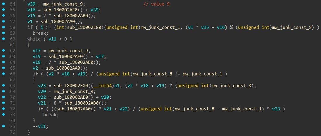 Every meaningful operation in the DLL is buried under layers of arithmetic junk code. Three global constants stored in the .data section feed into opaque predicates repeated hundreds of times throughout the binary. These expressions always evaluate to the same result based on the fixed constants (1, 8, 9), making them dead code. Their sole purpose is to inflate the binary and confuse decompilers, turning what should be a few dozen lines of logic into thousands.