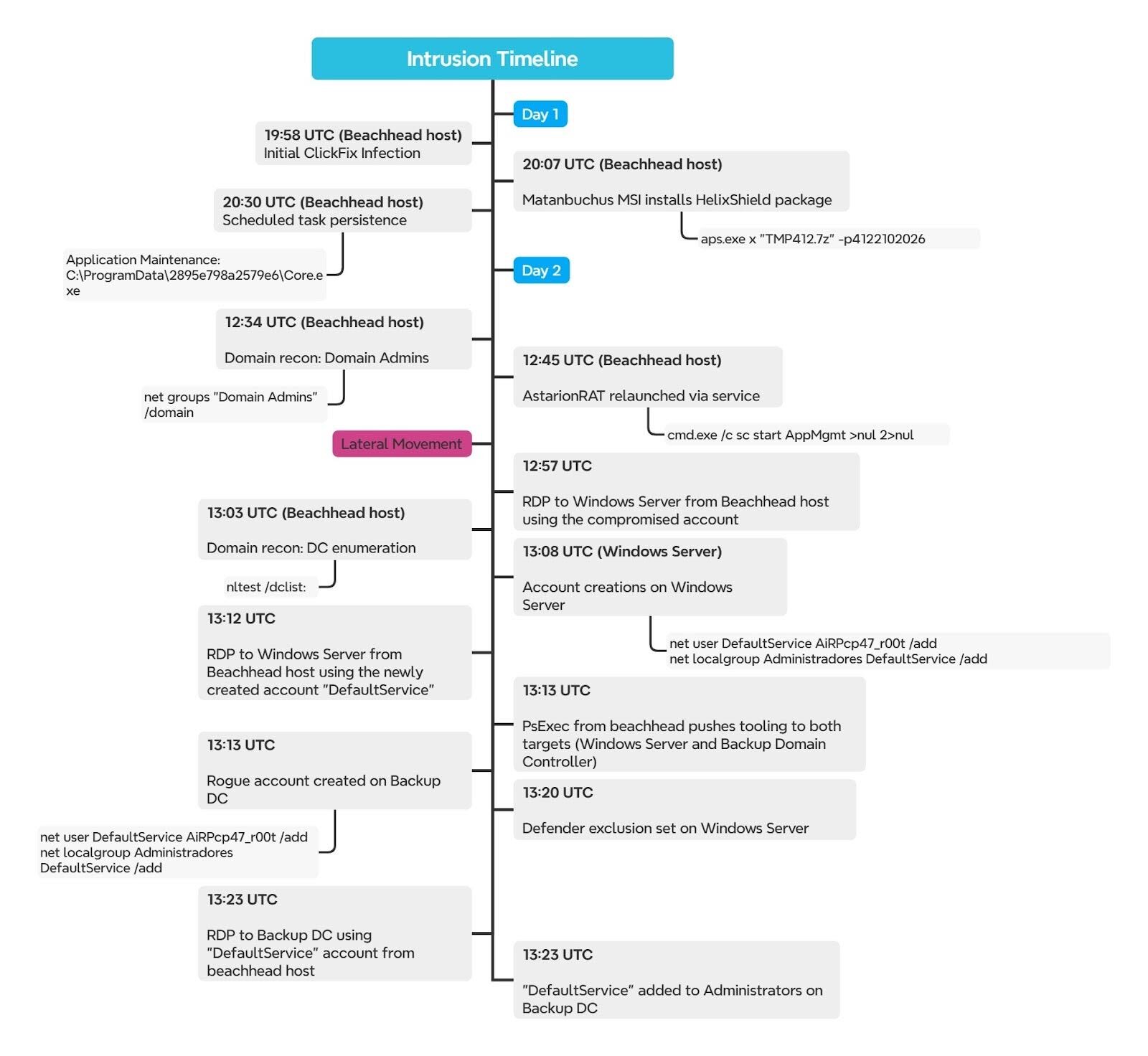 What followed the RAT deployment was a fast-moving intrusion: the operator returned the next day, moved laterally across the network within 40 minutes, hitting a Windows Server and two domain controllers, using PsExec, rogue account creation, and Defender exclusions.