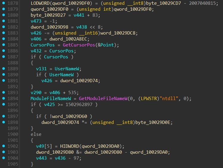 Figure 5: Junk code obfuscation in jli.dll, arithmetic expressions using fixed constants that always evaluate to the same result, inflating a few lines of real logic into thousands of lines of dead code.