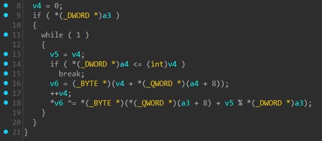 Figure 10: Each byte of the target buffer is XORed with a rolling key (key[i % key_len]), used to decrypt the import and relocation data before processing