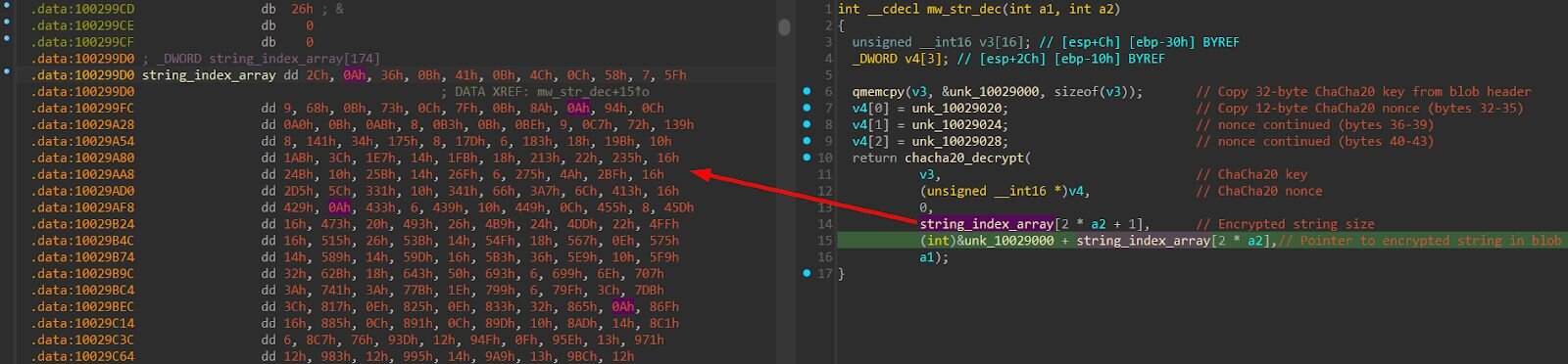 Figure 4: The string decryption function reads the ChaCha20 key and nonce from the first 44 bytes of the encrypted blob, then uses the string index array (left) to locate and decrypt individual strings by their offset and size.