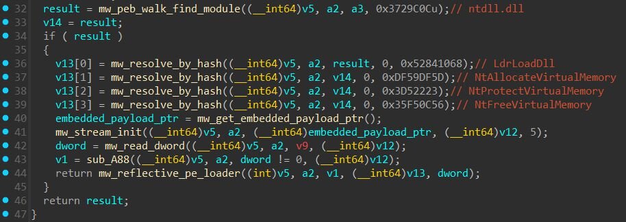 The entry point begins by walking the Process Environment Block to locate ntdll.dll and resolve four native API functions by hash using the following hashing algorithm (multiply-by-131 rolling hash):