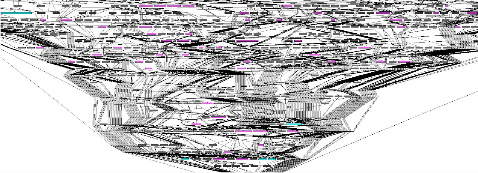 Figure 3: A graph overview of the Matanbuchus DLL, showing the dense web of control flow paths inflated by junk code, dead loops, and fake conditional branches throughout the binary