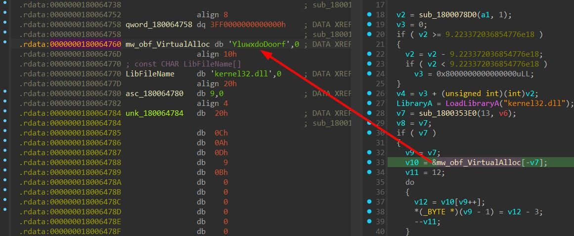 Figure 7: The obfuscated "YluwxdoDoorf" string is decoded at runtime by subtracting 3 from each byte to resolve "VirtualAlloc"