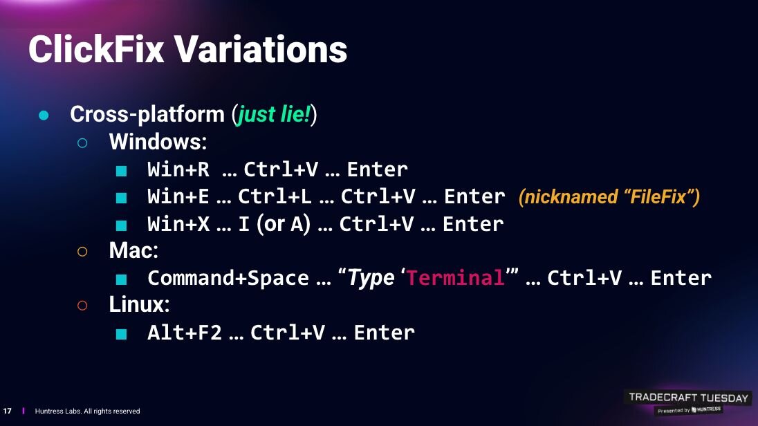 In anticipation of more ClickFix attack variants in the future, John Hammond has been building a resource called ClickFix Wiki that shows the variety of tools that can be used and abused in ClickFix attacks, the lures that might trick individuals, and the subsequent mitigations.