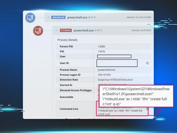 The above command line uses tasklist.exe to locate the LSASS process and then use the native comsvcs.dll to dump the process memory. An example of another, similar process being detected appears in Figure 3.