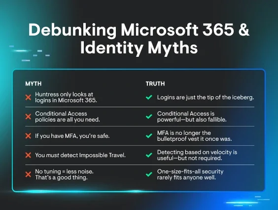 Here at Huntress, we believe in clarity over cloudiness. So let’s bust some of the most common Microsoft 365 and identity security myths floating around out there. If you’ve heard statements like “logins are only 2% of the data” or “you don’t need more protection if you have MFA,” you’ve likely caught a whiff of one of these myths. Let’s break them down.