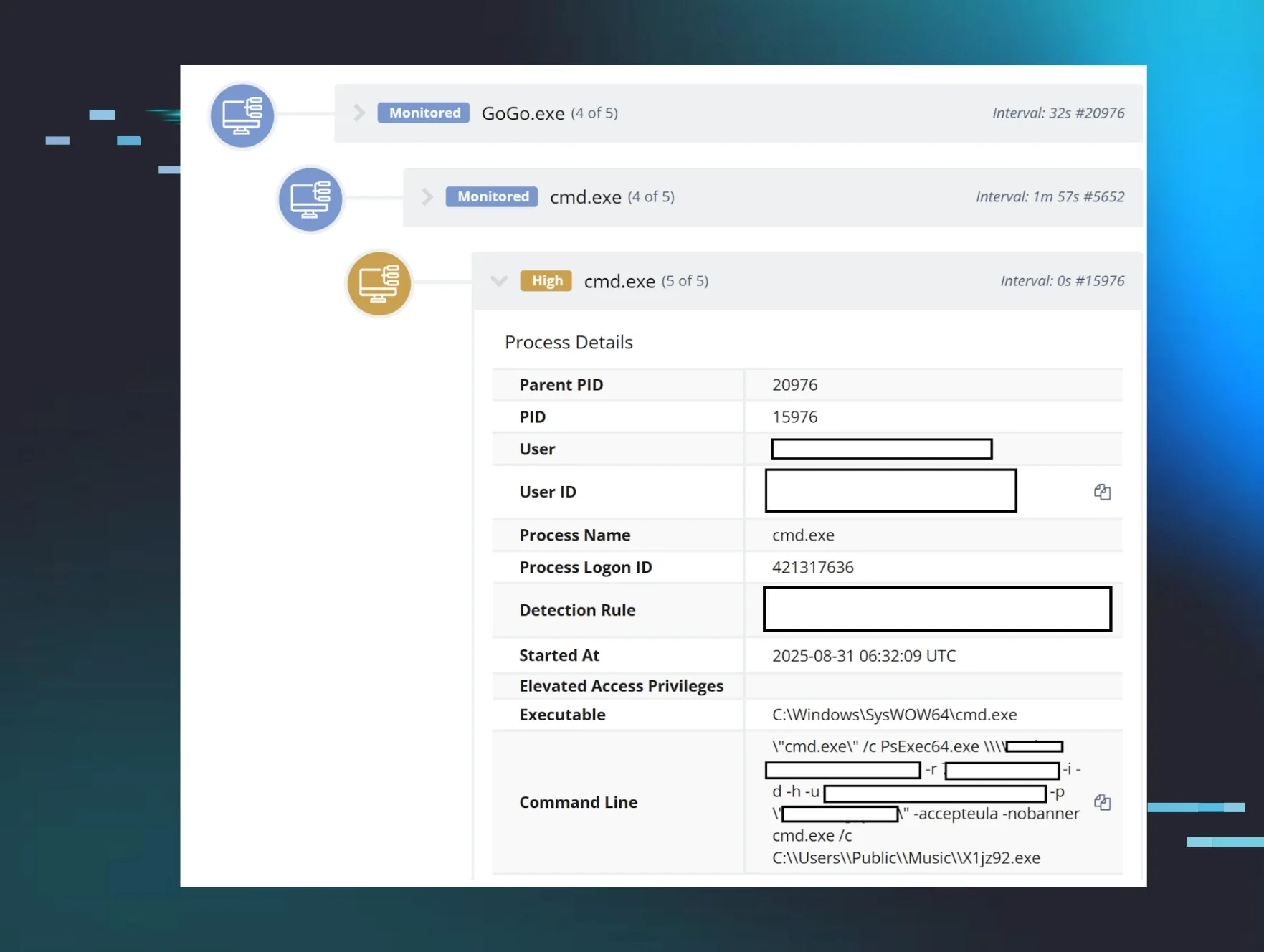 When launched, the command line would spawn multiple PsExec64.exe processes; Figure 2 illustrates the GoGo.exe process tree.