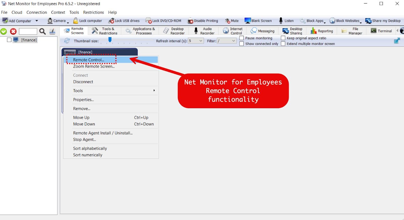 Figure 3: Net Monitor for Employees Professional console interface showing remote control, screen monitoring, desktop recording, file management, and terminal access capabilities.