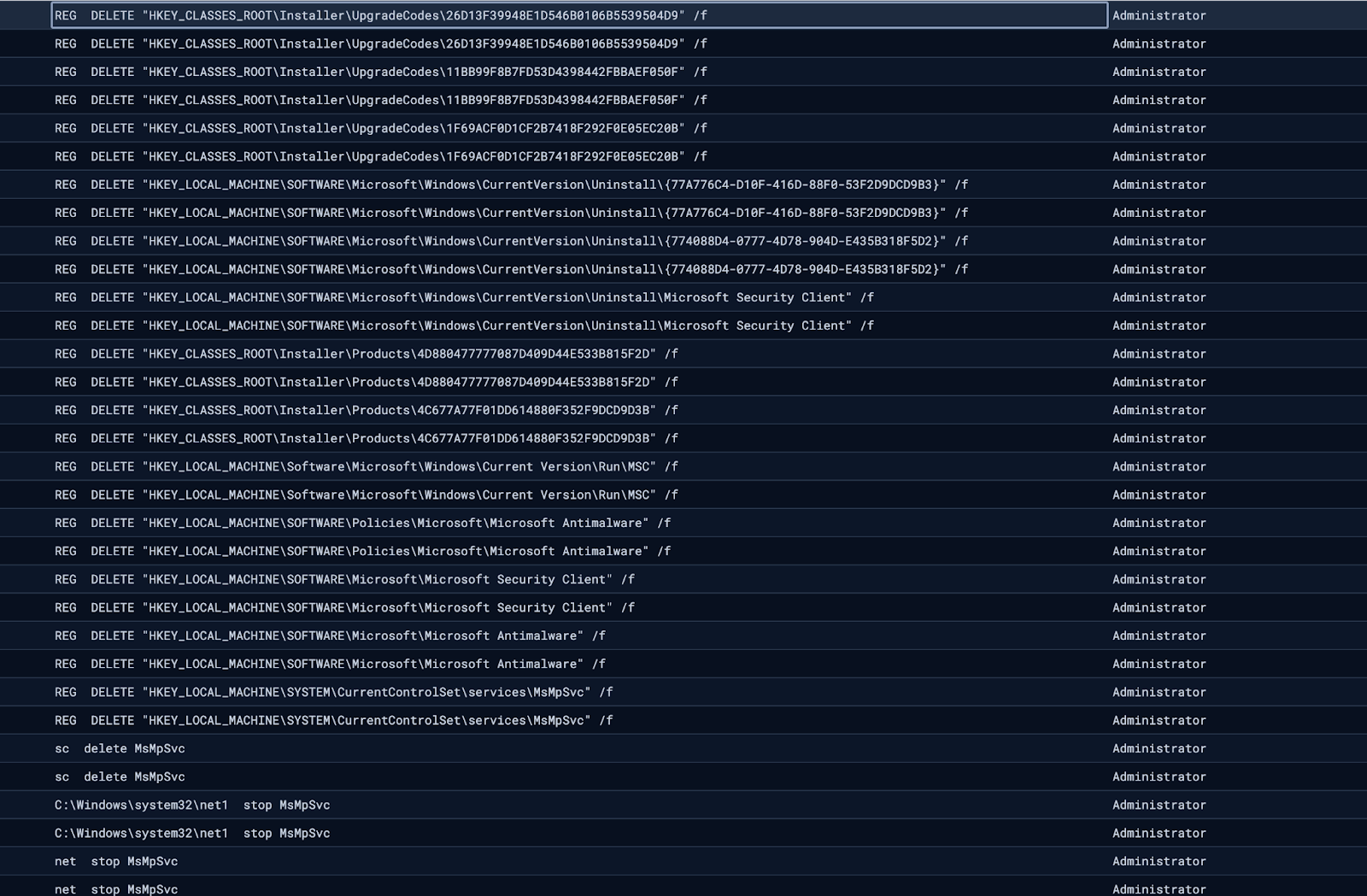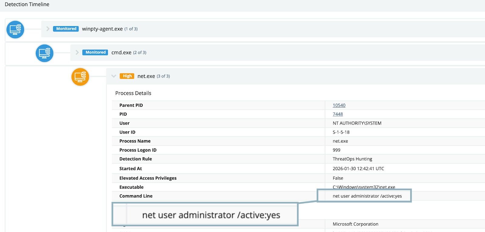 Remote management software is often used to administer user accounts, but something about this particular instance felt off, so we continued to investigate the affected endpoint. Interestingly, we observed multiple instances of various iterations of net commands—these commands ran the gamut of user enumeration, attempting to reset passwords and create additional user accounts on the host. An attempt at enabling the built-in Administrator account was also observed: