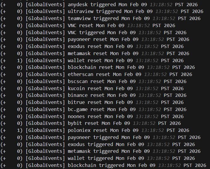 Interestingly enough, the SimpleHelp agent was also configured with keyword-based monitoring triggers via GlobalEvents, revealing the threat actor's financial motivation. The logs show the agent continuously cycling through trigger and reset events for cryptocurrency-related keywords, including wallet services (metamask, exodus, wallet, blockchain), exchanges (binance, bybit, kucoin, bitrue, poloniex, bc.game, noones), blockchain explorers (etherscan, bscscan), and the payment platform payoneer. Alongside these, the agent also monitored for remote access tool keywords, including RDP, anydesk, ultraview, teamview, and VNC, likely to detect if anyone was actively connecting to the machine. These triggers fired repeatedly in rapid succession, suggesting they were configured to alert the operator whenever any of these keywords appeared in window titles or browser activity on the compromised host.