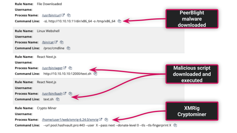 A Linux endpoint was targeted with a React2Shell exploit, installed the PeerBlight malware, and then attempted to install the XMRig cryptominer, an open-source tool primarily used to mine cryptocurrencies like Monero (XMR). This is a common type of attack, as Linux endpoints are usually running 24/7 on high-performance servers or cloud instances, making them ideal for cryptominer attacks.