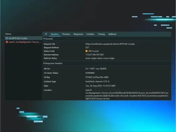 The initial link for the fake AnyDesk installer redirects users to https[://]anydeesk[.]ink/download/anydesk[.]html, which displays a Cloudflare Turnstile - and a very questionable UI. The page purports to support “Secure Access Verification”, prompting the user to click a single button on the Cloudflare Turnstile to “verify you are human.”
