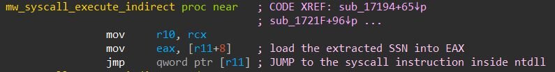 Figure 10: The indirect syscall executor: loads the extracted SSN into EAX, then jumps to the syscall instruction inside ntdll