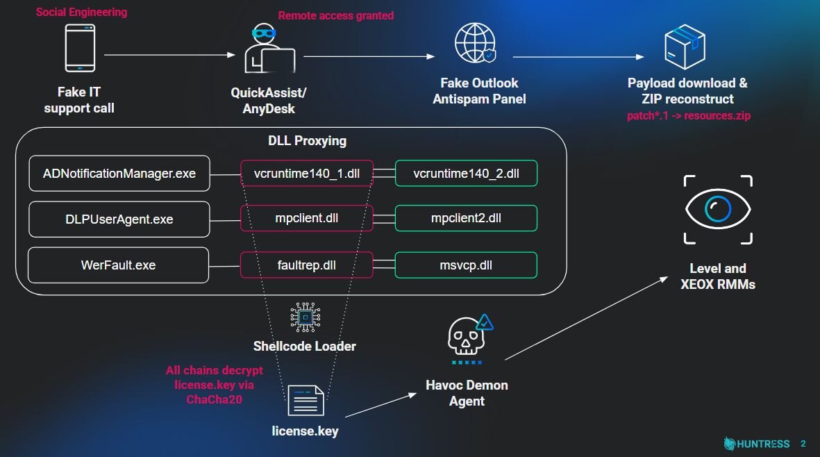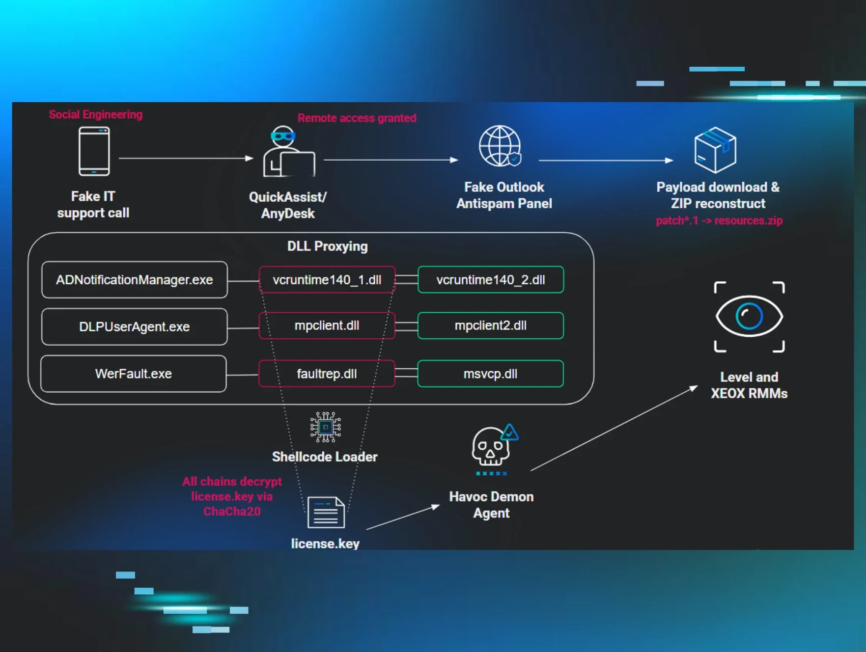What begins as a phone call from “IT support” ends with a fully instrumented network compromise - modified Havoc Demons deployed across endpoints, legitimate RMM tools repurposed as backup persistence. This campaign is a case study in how modern adversaries layer sophistication at every stage: social engineering to get in the door, DLL sideloading to stay invisible, and diversified persistence to survive remediation.