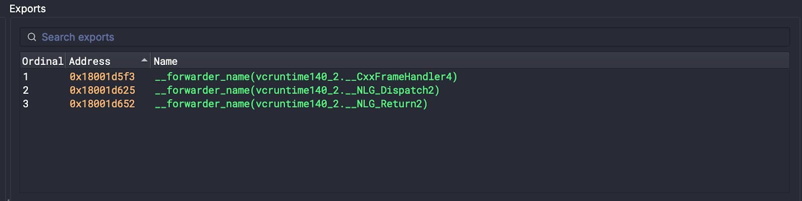 We’ll be looking at vcruntime140_1.dll for the remainder of the analysis, as it employs far more novel techniques, and the adversary has clearly taken some creative liberties after their last malicious payloads.