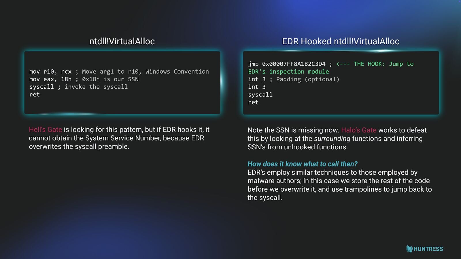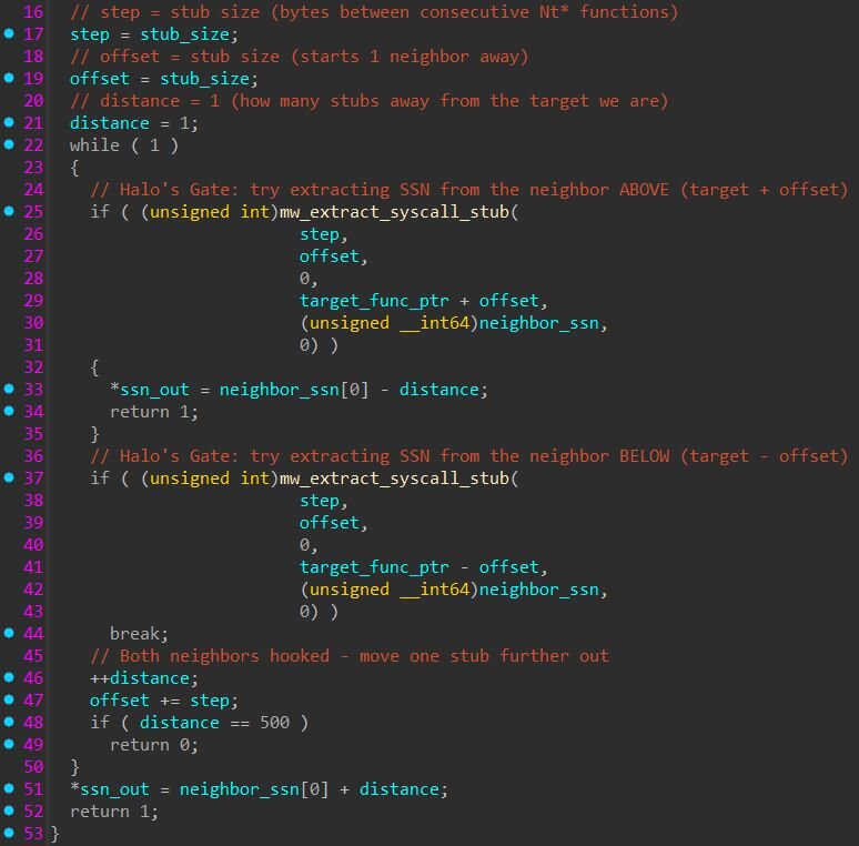 Halo’s Gate, a spin-off, was also developed by @vxunderground as a backup in the event that EDR has effectively hooked these functions in a manner that defeats Hell’s Gate’s pattern based search. If the stub that Hell’s Gate would select appears hooked by EDR (i.e., the expected mov r10, rcx; mov eax, <SSN> pattern is altered), the binary walks neighboring syscall stubs and derives the correct SSN by calculating the offset between clean entries.