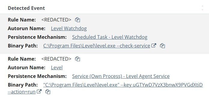 Figure 15: Huntress detections for Level RMM agent persistence, showing the enrollment key used to register the agent to an adversary-controlled tenant