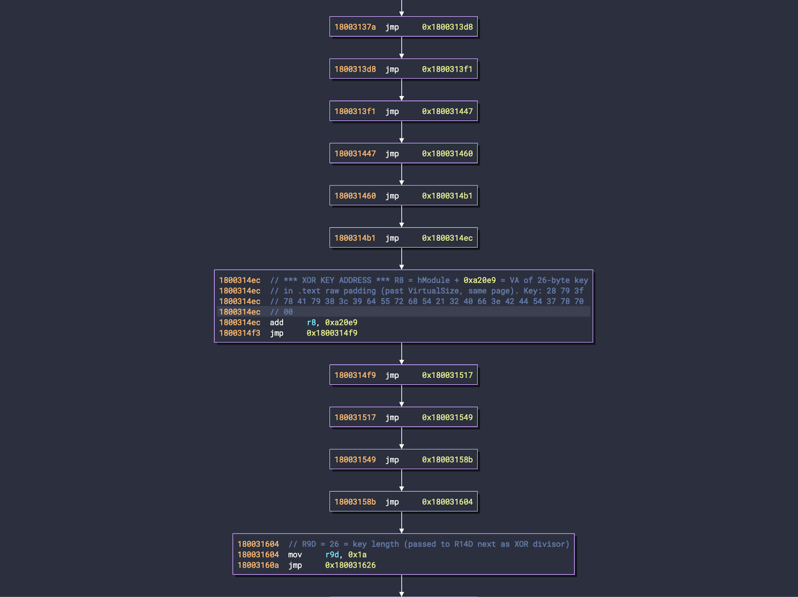 The payload was stored in the .rsrc section of the binary, behind numerous trampolines setting up the XOR decryption process and execution of embedded shellcode.