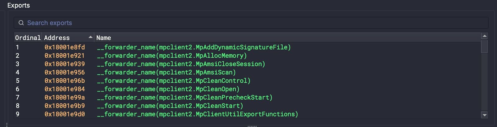 Figure 5: DLL Forwarding in malicious mpclient.dll, pointing to mpclient2.dll, totaling 158 forwarded exports
