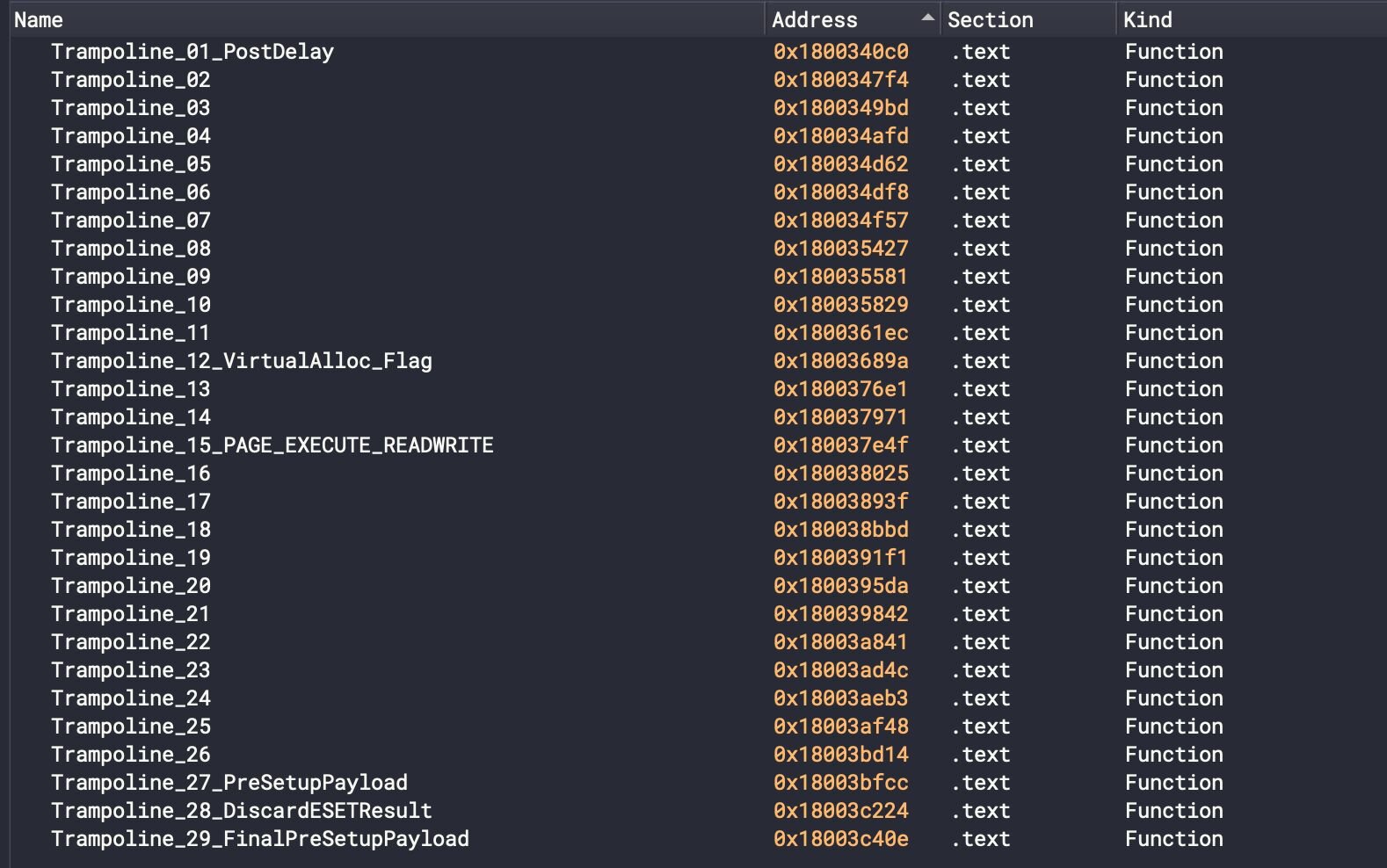 Analysing these binaries was heavily impeded by the adversary’s obfuscation tactics. Their primary method to make reverse engineering difficult was the heavy use of “trampolines” or arbitrary jumps to other positions in the code. This tactic was made more effective by inserting subtle components of required malicious code within these trampolines. This works against reverse engineering tooling by ‘confusing’ the decompiler’s understanding of the code at a given position, and further makes it difficult to reason about what arguments and values may exist in the call frame at a given point in time. In fact, the adversary’s heavy use of trampolines required that they also account for the unconventional way they used the language, specifically during the Hell’s Gate preamble, which we’ll discuss later in depth.