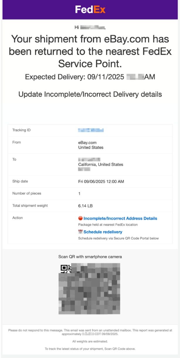 Figure 6: A FedEx phishing email with an ASCII QR code