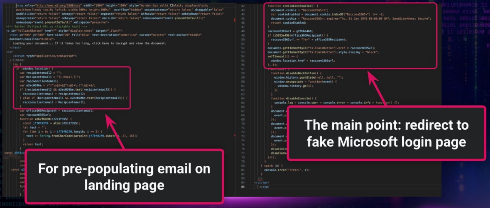 For this specific phish, the attached SVG file opens in-browser and redirects the target to a fake Microsoft login page. The attack relies on Raccoon0365, a popular phishing kit, which gives attackers various capabilities, including the ability to attempt to pre-populate victim emails on the landing page to increase its credibility (see Figure 3 below).