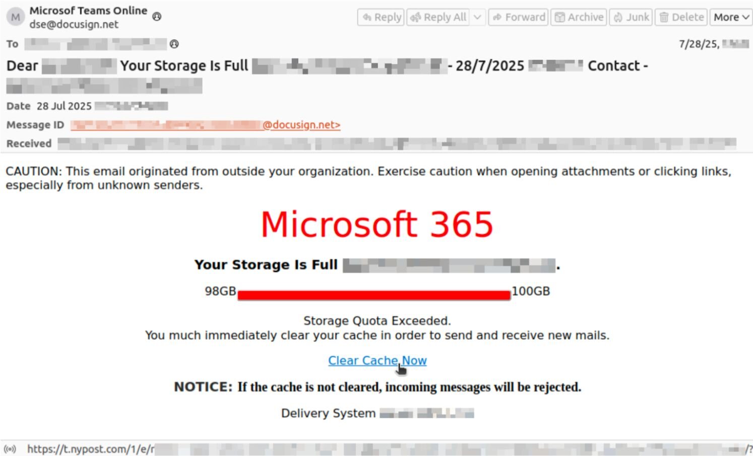 Consider the phishing email below, for example. The “Microsoft 365” email tells the target that their storage is full, and they need to “clear your cache in order to send and receive new emails.” Though the email header says the sender is “Microsof Teams Online” (note the spelling error), the email address is from Docusign (dse@docusign.net).
