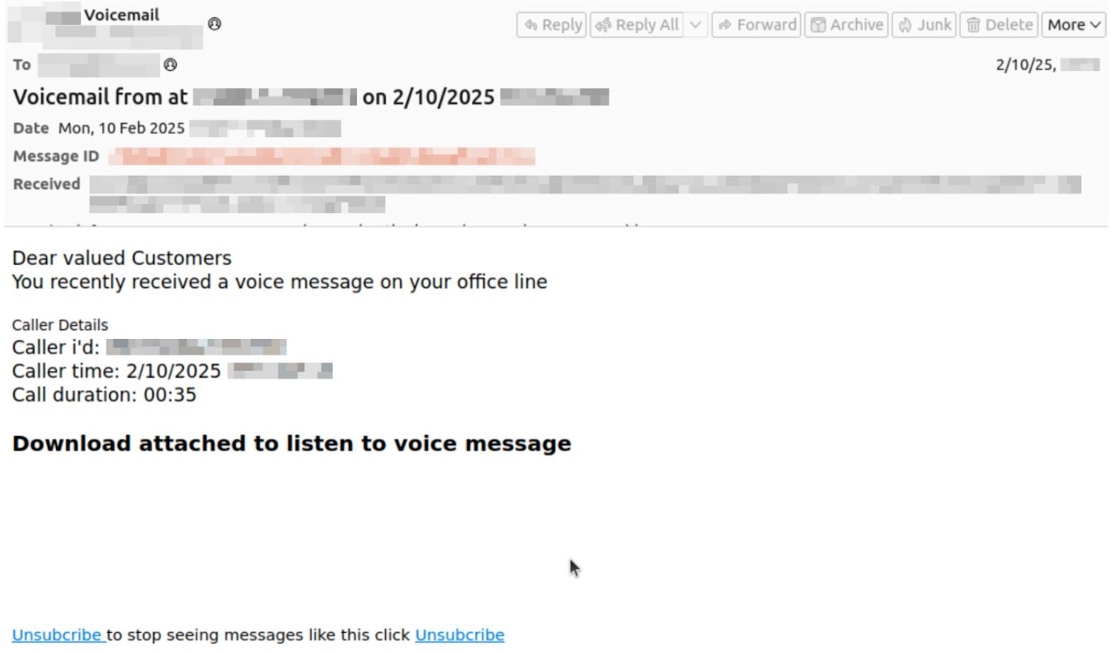 Scammers thrive on a sense of urgency, and what can be more pressing than a missed work phone call? This plays into the continued success of the voicemail lure, where attackers send “voicemail notifications” via email, telling targets they’ve missed a call and prompting them to “listen to the voice message” or “view the transcript.” Of course, whatever lure they may use convinces the target to interact with the email, which is typically designed to take them to a landing page and either enter their credentials or unwittingly download malware.