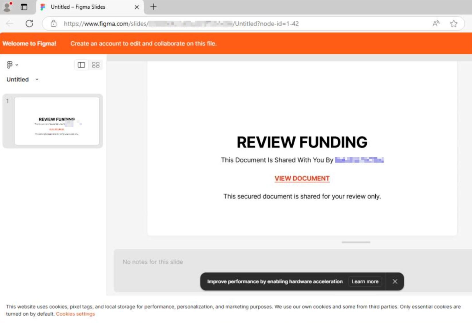 For instance, the email below from prototyping tool Figma (no-reply@email.figma.com) tells recipients to “Review Funding” and directs them to the legitimate Figma website (figma.com). On the backend, threat actors have set up the webpage to tell victims to view a document–and that then takes them to a fake Microsoft login page.