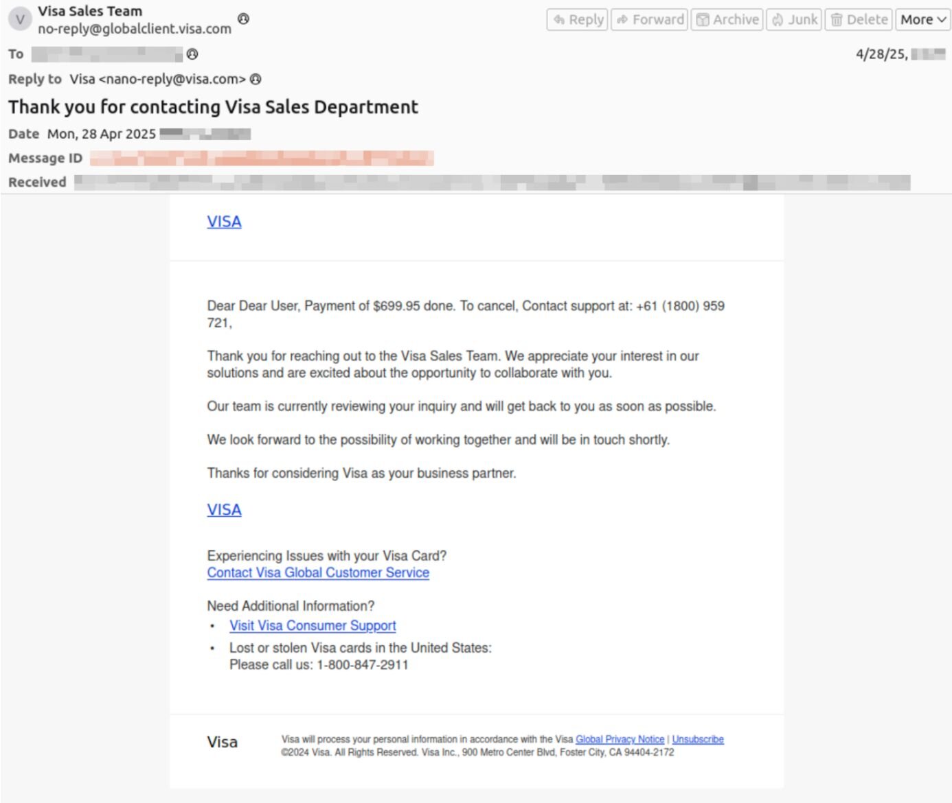 In the email below, the attacker claims to be from Visa (using the sender address no-reply@globalclient.visa.com) and informs the target that they have made a $699.95 payment. In order to cancel the payment, the recipient should contact a “support” number, says the email. The example below shows an email sent to an Australian user, and the phone number is formatted accordingly.