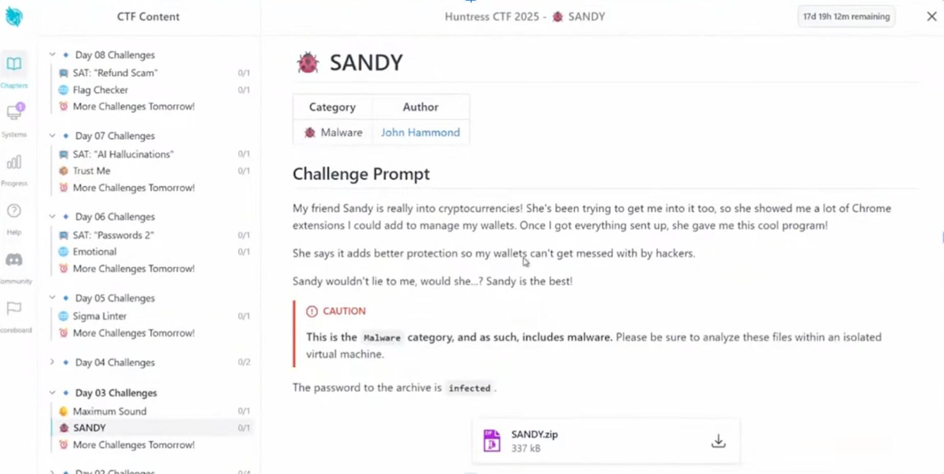 In fact, this isn’t just any CTF–it’s the annual October event put on by Huntress, which over the last two years has drawn fierce competition. This year’s event was no different, with 11,898 registered users and 6,892 teams. The challenge described above–“Sandy”–was only on the third day of the event, and there were 30 more days of challenges full of twists and turns.