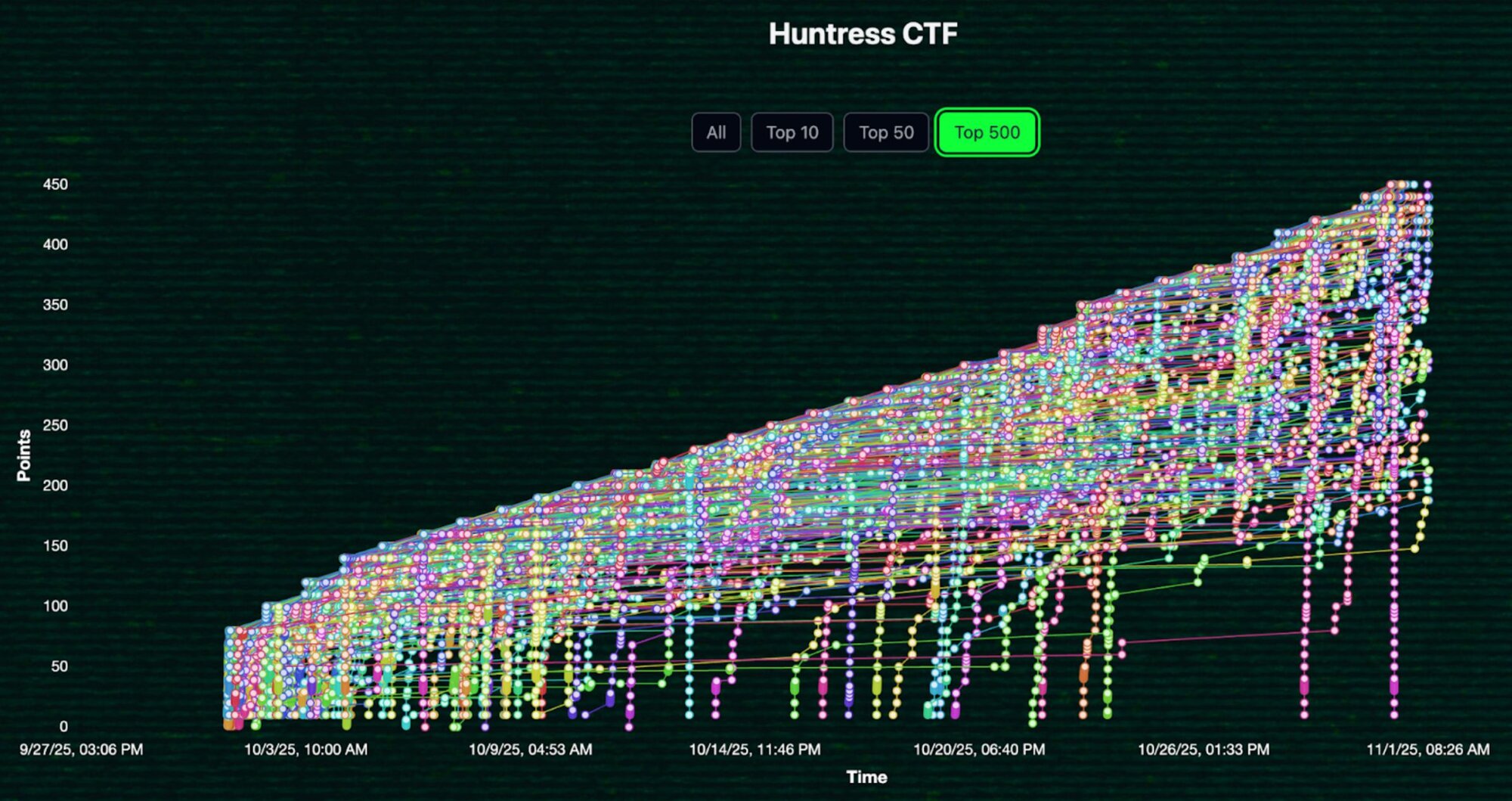 Figure 2: Huntress CTF 2025 scoreboard for the top 500 players