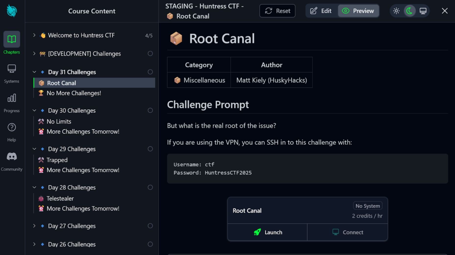 The ultimate goal? Find the flag and submit it to earn points. Some do it for fun or to hone their craft and creativity, while others compete for the top spot and for a chance to win some epic prizes (in our case, winners got gift cards, RDV4 Kit (360), OMB Cable Elite, Huntress swag, and more).