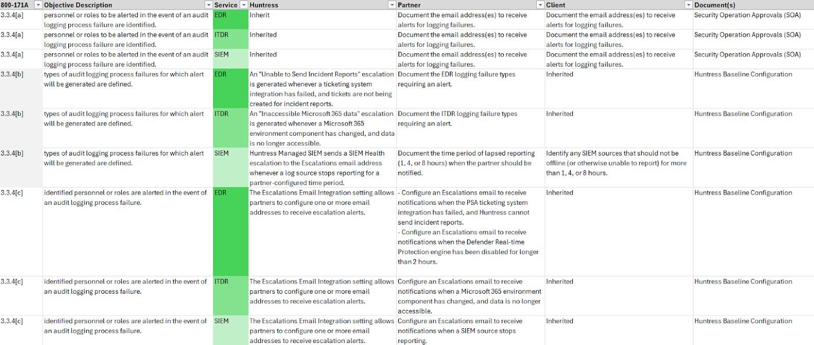 A Shared Responsibility Matrix (SRM) that includes Huntress capabilities, partner actions, and client actions, so stakeholders can more easily understand their contribution to meeting a NIST 800-171A objective.