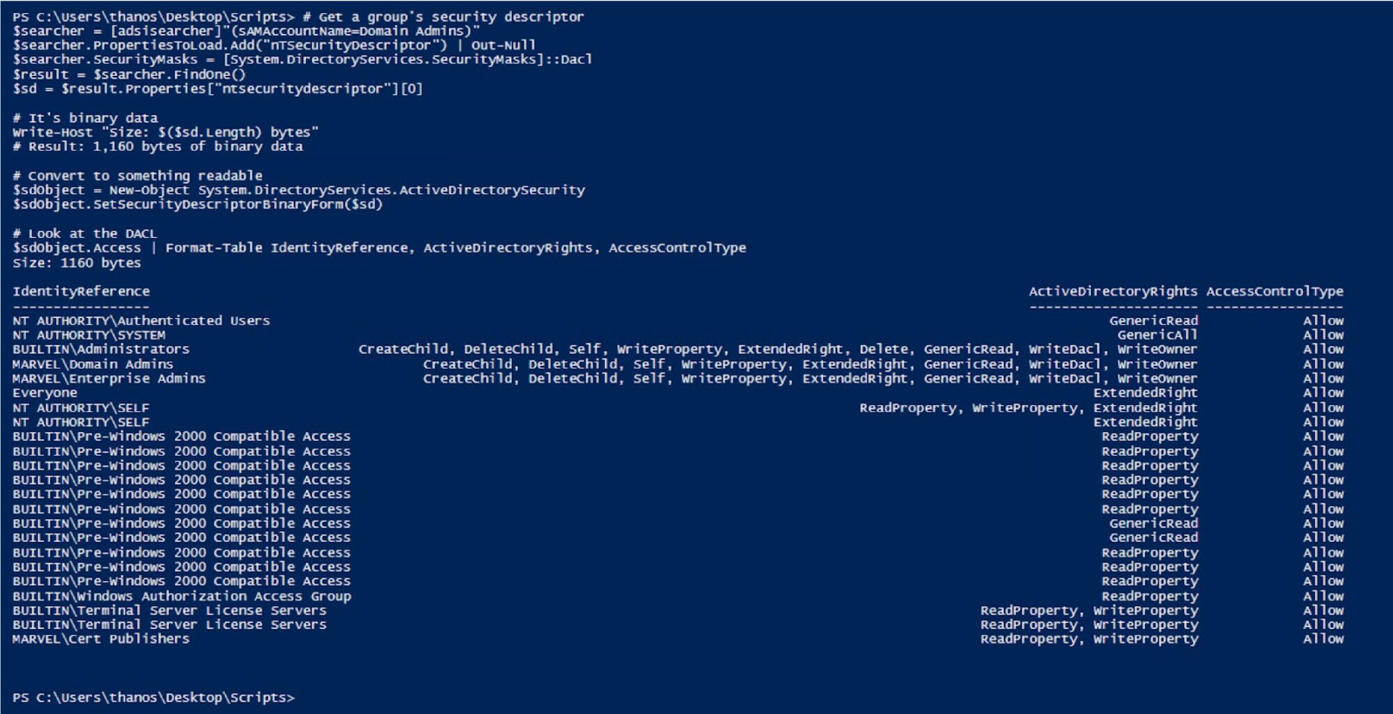 Figure 2: Querying nTSecurityDescriptor reveals who has the permissions on the Domain Admins Group. This is what attackers are after: the permission relationships that reveal attack paths.